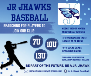 Jr Jhawks Baseball is home to competitive, character-driven youth baseball on the west side of Cedar Rapids. Serving players ages 7U through 14U, our program is dedicated to developing strong fundamentals, confident athletes, and a love for the game in a positive, supportive environment. With experienced coaching and a focus on smart competition and teamwork, Jr Jhawks Baseball prepares players for success on the field today and at the next level.